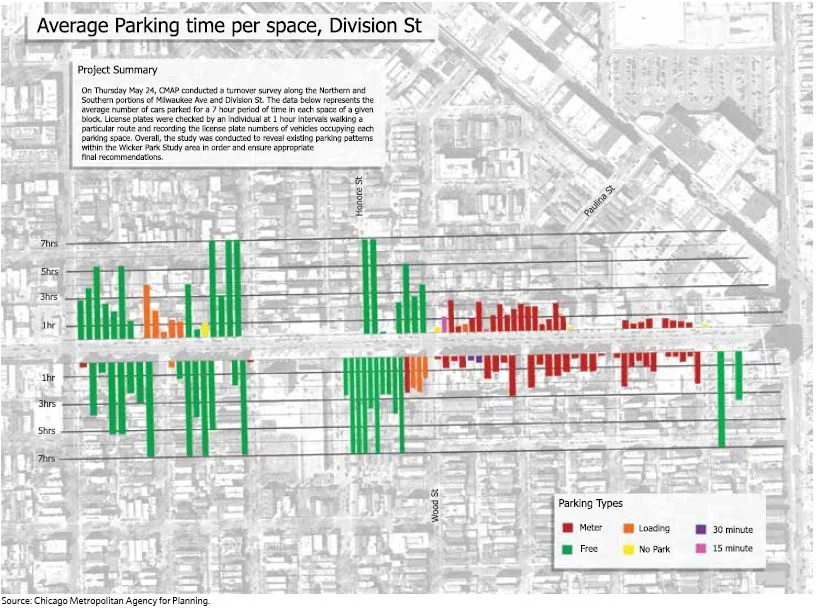 Last year the Metropolitan Planning Council (MPC) partnered with the Chicago Metropolitan Agency for Planning and the Wicker Park-Bucktown Chamber/Special Service Area #33 on a parking study for the Wicker Park-Bucktown neighborhood on the city’s near northwest side. We found that of the almost 12,000 on-street parking spots in the Wicker Park-Bucktown neighborhood, the vast majority—almost 11,000—are free and not metered. Some sections of even the high-traffic retail corridor had free parking, including Damen, Armitage, Ashland and Western avenues and Division Street.